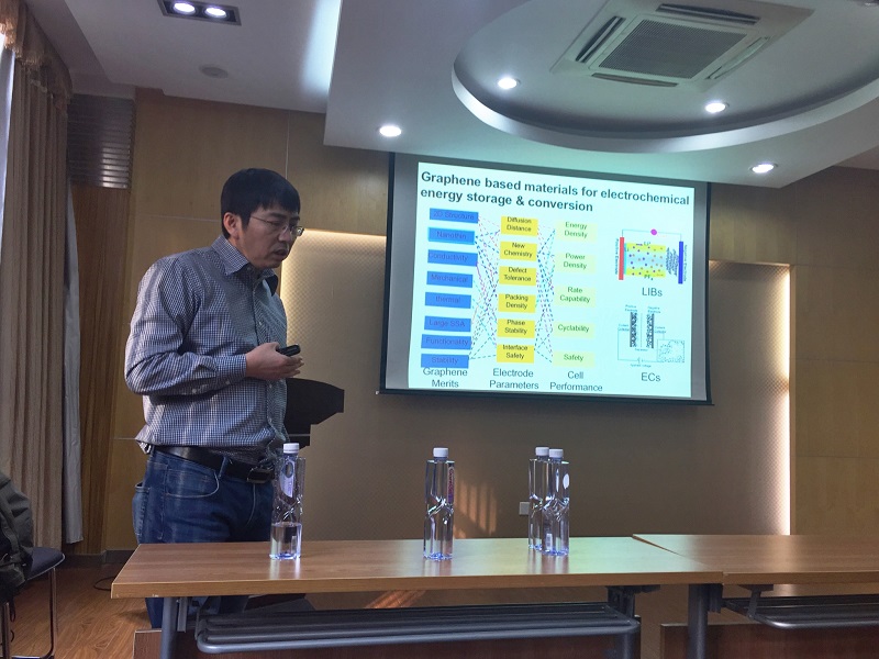 在讲座中,李峰教授结合课题组已有工作成果,从基础研究、材料研究到器件研究以及产业化发展,层层递进,介绍了石墨烯与金属氧化物的协同作用,石墨烯基材料在柔性电极等新型电池器件、以及锂硫电池正极材料载硫中的应用,以及电化学电位调控等几个方面的内容。他指出了石墨烯等新型炭材料在电化学能源存储中的巨大价值和研究潜力,从材料学的机理,向老师和同学们展现了碳基材料在电化学中的魅力。讲座现场座无虚席,李峰教授精彩的报告激发了老师和同学们对于电化学的更多方面的思考,报告后,他与师生们展开了热烈的讨论。李峰教授对于科研的严谨作风、深入浅出的讲解、以及对学生和蔼的态度,在同学们心中留下了深刻的印象。