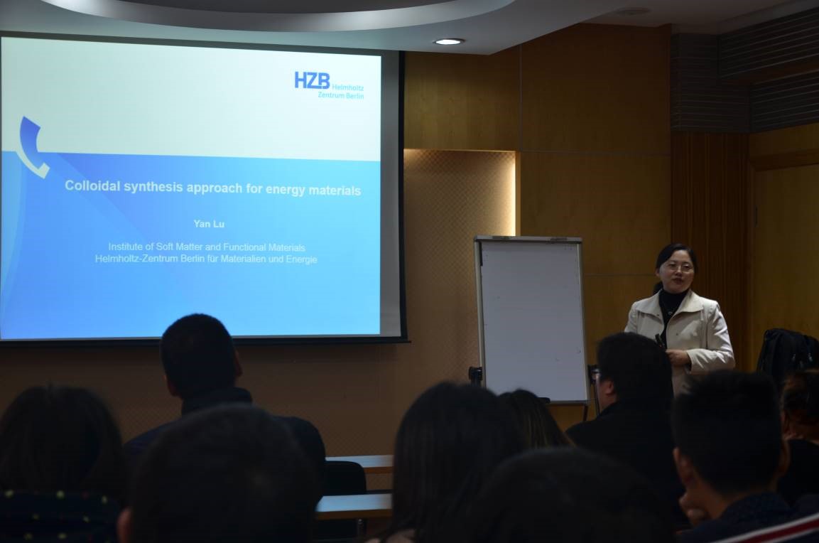 陆琰副教授作了题为“Colloidal Synthesis Approaches for Energy Materials”的学术报告(图2),介绍了温敏性聚合物PNIPAm与纳米CuO2的复合粒子制备及其在催化剂、传感器等领域的应用。她还介绍了用聚合物模板制造中空纳米碳材料,用于制作超级电容器材料,以及多孔Ti4O7的纳米材料在锂硫电池中的应用。她的研究拓宽了有机模板在能源化工中的应用。