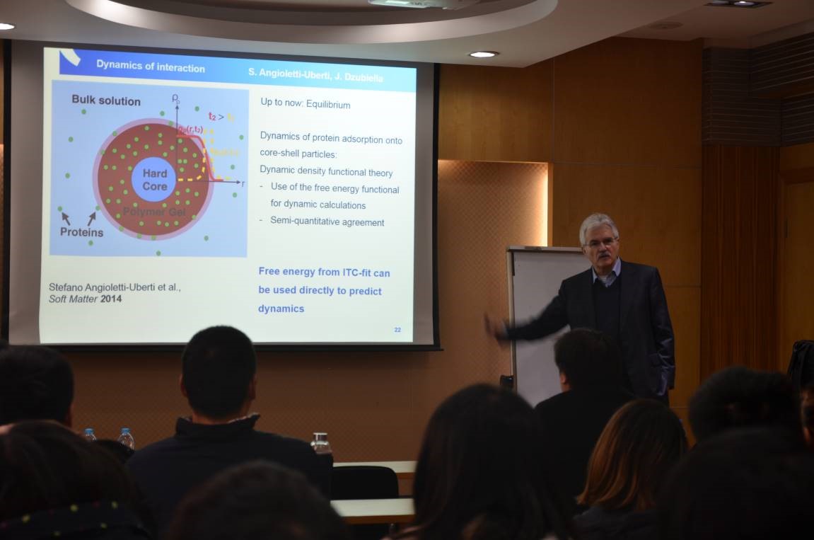 师生带来题为“Self-assembly of Proteins with Charged Polymers: Comparing experimental Data to Theory and Simulation”的学术报告(图1)。他的报告主要是关于聚电解质刷与蛋白质的相互作用,通过理论分析和计算机模拟,进一步加深了对其相互作用机理的理解。Ballauff教授丰富的知识和深入浅出的介绍,使欧美无码