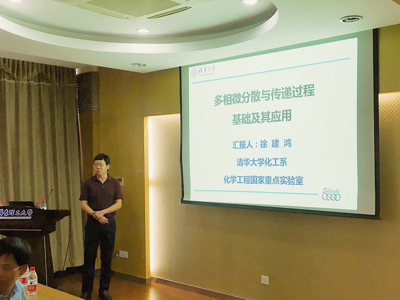 报告会上,徐建鸿研究员首先介绍了在多相微分散新方法、微尺度分散和传递特性及其内在机理等方面取得的重要研究进展。接着,他结合己内酰胺酸团萃取分离、纳米碳酸钙颗粒合成等化工过程,深入浅出地向在座师生介绍了如何在基础研究成果的指导下,实现微化工设备的可靠放大。此外,他也分享了他们基于微化工技术在稀土元素富集回收、医药化学品高效合成和精细乳液产品连续制备等方面的最新研究进展。
