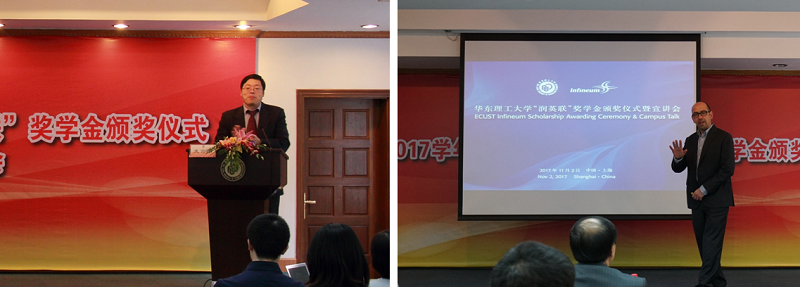 Chris Locke先生则分享自己的成长求职经历,同时详细介绍了润英联的基本情况、发展历程及企业文化,表达了对华理的喜爱与公司对华理学子的欢迎。随后崔姗姗副部长宣读了本年度润英联奖学金获奖名单,校企嘉宾为获奖同学颁发证书、合影留念;获奖的研究生代表陈燕和本科生代表李雨柔分别对学校的培育、老师的教导和润英联公司致以感谢,表达了继续努力提升自己为社会发展做出贡献的决心。
