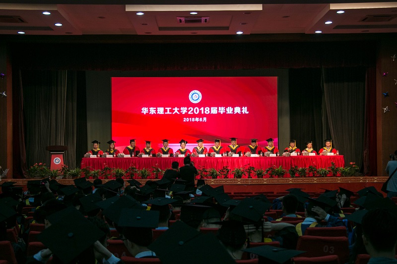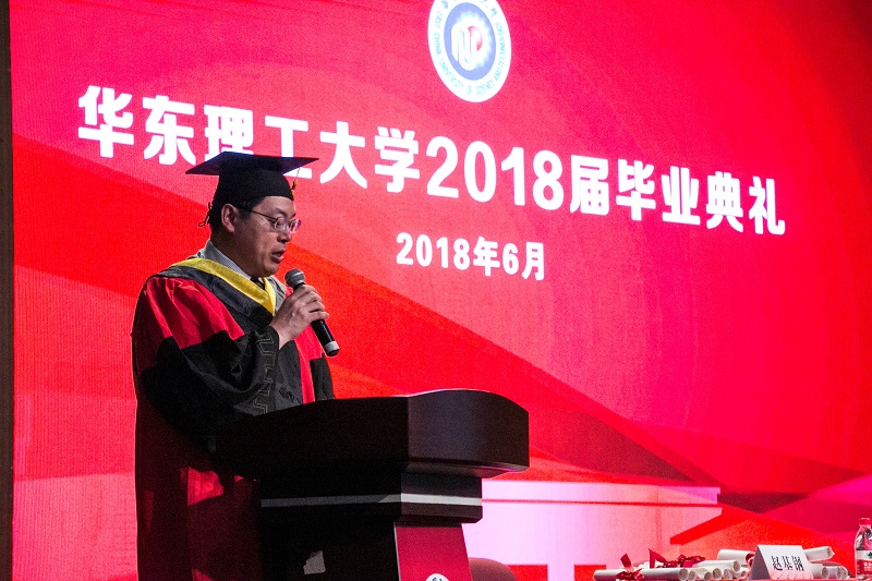 会场2018届毕业生代表崔然上台发言,分享了在华理生活的点点滴滴,表达了对母校、同窗和老师们的依依惜别之情,同时也表示要传承与践行华理勤奋求实、励志明德的校训,为母校争光。