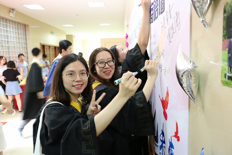 会场的仪式圆满结束。会后,同学们在大礼堂话离别,并把最想对母校说的话写上了寄语墙。2018届毕业生将带着华理的嘱托,牢记誓言,开启新的人生篇章。