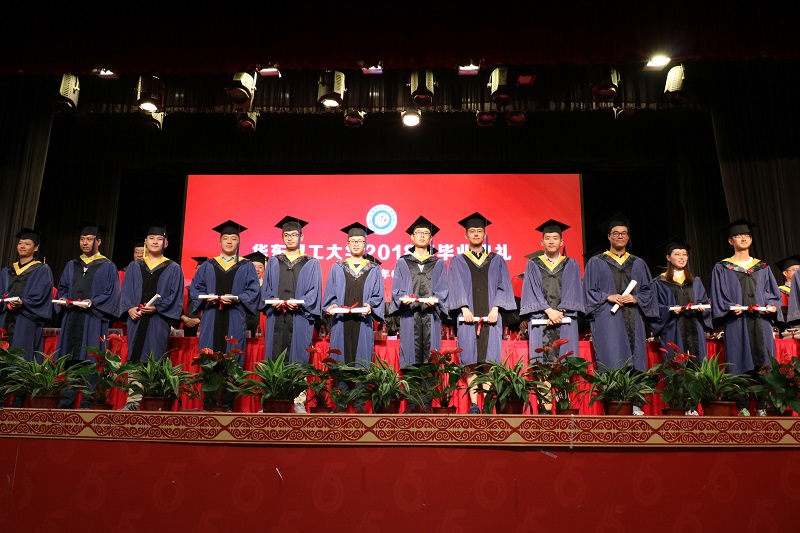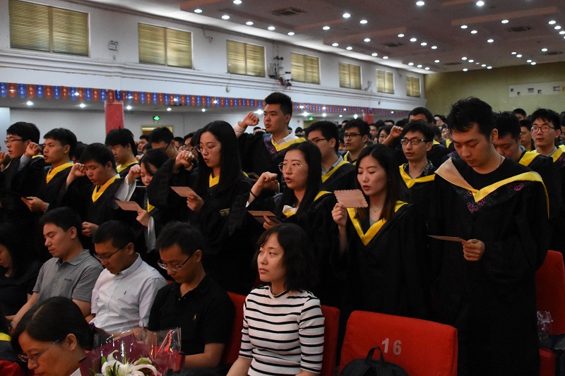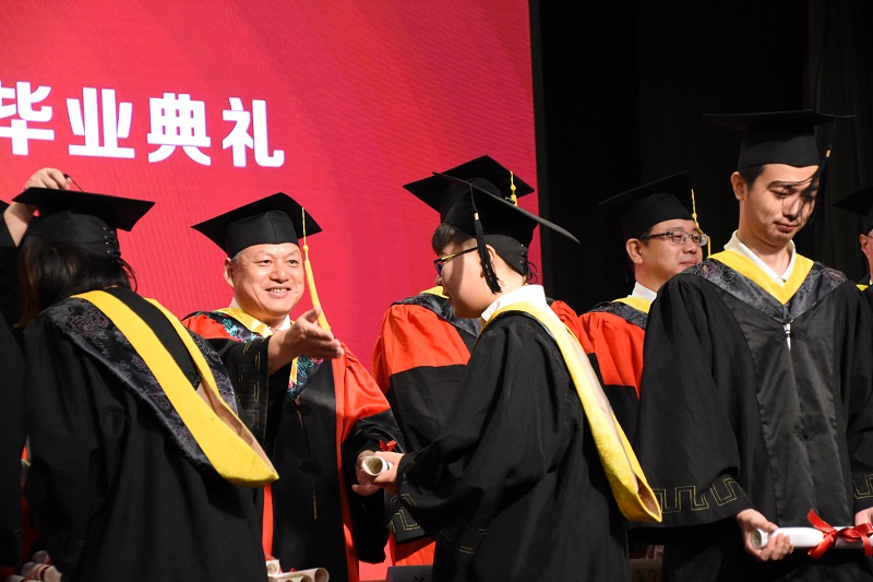 在激昂的音乐声中,校、院领导和教师代表为全体毕业生拨穗正冠并赠送毕业卷轴。