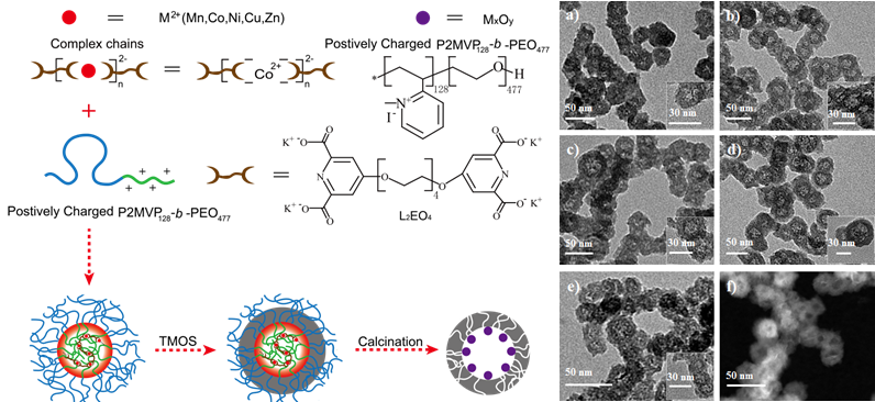 创新性地发展了一种利用聚电解质胶束为模板制备含功能性过渡金属氧化物纳米颗粒的中空介孔纳米反应器的通用方法。研究人员通过静电力作用自组装形成含金属离子的聚电解质胶束,并以此为模板沉积二氧化硅,随后通过焙烧处理获得一系列含金属氧化物纳米颗粒的二氧化硅反应器MxOy@hm-silica(M = Mn、Co、Ni、Cu、Zn)。