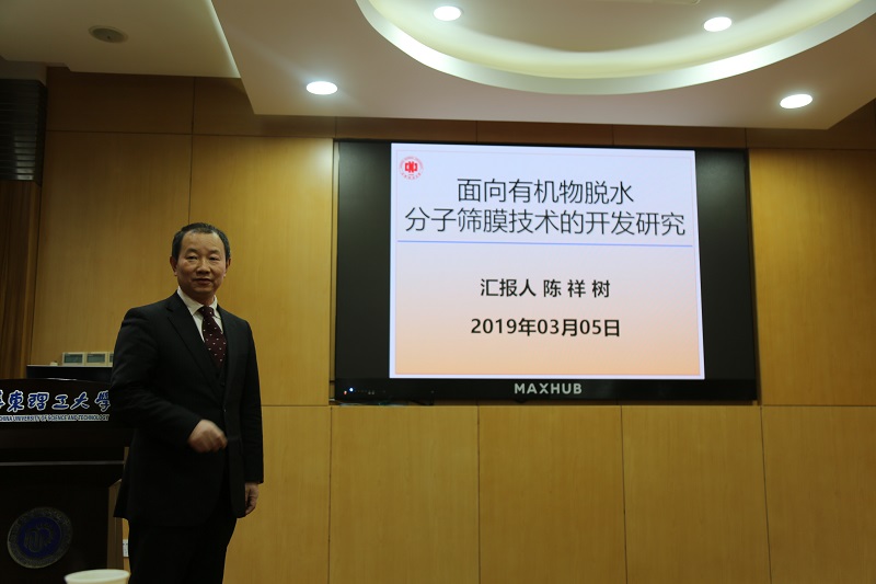 朱学栋主持学术报告,介绍了陈祥树教授的学术经历和在分子筛膜分离技术方面研究的基本情况。随后,陈教授向大家介绍了课题组近年来研制出的两种高效、高性能的节能减排膜材料的开发研究——用于燃料乙醇等分离用的透水性NaA型分子筛膜,及耐酸类有机物脱水的耐酸性MOR型分子筛膜材料,并重点介绍了在F介质中MOR型分子筛膜制备条件的优化,及在优化条件下工业规格高耐酸性MOR膜的制备和年产量千吨级应用示范装置。报告会后,与会师生踊跃提问,陈祥树教授深入细致地回答了提出的问题。