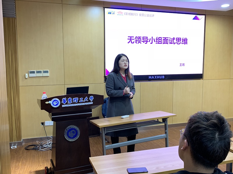 讲座开始后,本次活动由前程无忧校园职业培训首席讲师、前程无忧职业课程教研中心总监、职业规划与发展辅导咨询师、前程无忧高校事业部高级经理王宵老师主讲,她为同学们解释了无领导小组讨论的定义与应用,并将大家以6-7个人分为一个小区,并进行自我介绍。王宵告诉同学,向团队成员作自我介绍几乎是面试的开场必考题。自我介绍的过程既是暖场,又能留下重要的印象点,因此同学们要进行充分准备,在字里行间向面试官透露出自己的优点。