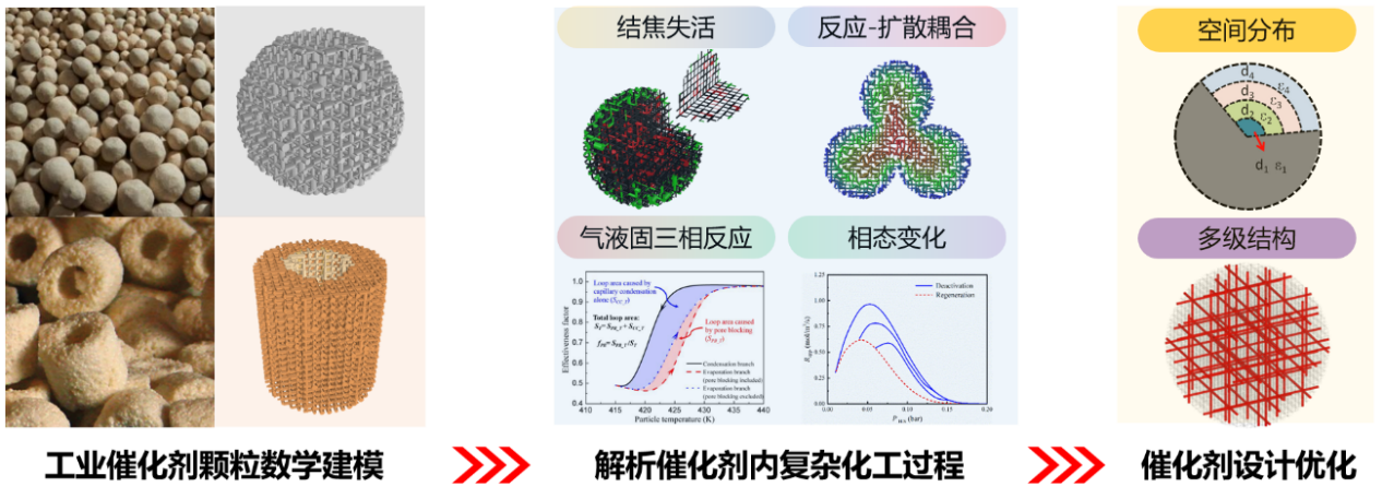 催化剂是现代化学工业的支柱,是化工生产的核心技术。工业颗粒催化剂的开发包括微观尺度活性位的设计和介观尺度载体颗粒的设计。目前,大多数的研究集中在微观尺度活性位上,却很少有研究者关注介观尺度载体方面的研究。催化剂颗粒内具有非常复杂的多级孔道结构和丰富的表界面结构,这些复杂结构内又发生着复杂的扩散-反应耦合过程。为了理性设计催化剂颗粒内的孔道结构和表界面结构,需要借助合理的数学模型。