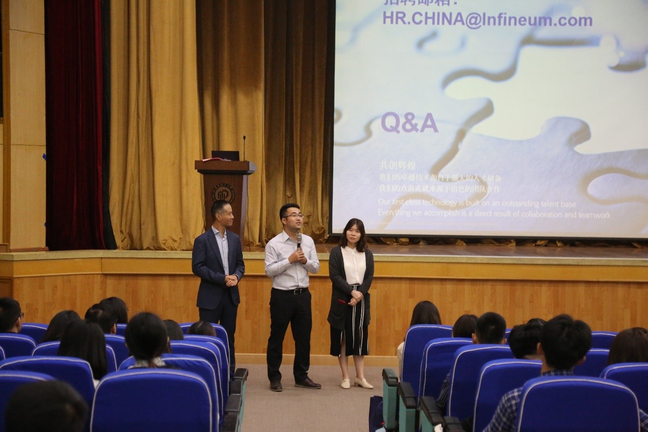 颁奖仪式结束后,润英联公司还举行了企业校园宣讲会。中国工厂总经理叶磊先生介绍了公司概况和发展理念,人事专员陈思女生讲解了公司的培养体系,校友皮志鹏先生分享了在润英联的工作体会,随后的互动环节三位嘉宾回答了到场学生的提问,现场气氛活跃,同学们纷纷投递简历。