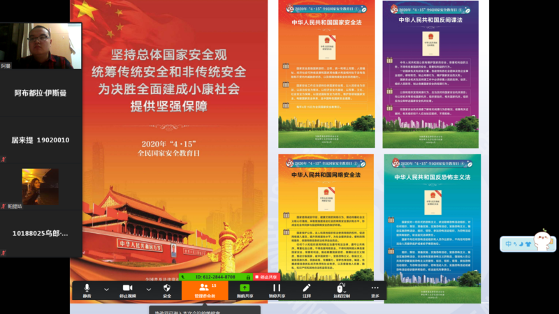 会上,阿布都拉向与会师生在线主讲了题为《坚守国家利益,做爱国守法的新时代少数民族大学生》讲座,强调国家安全涉及国家社会生活的方方面面,是国家、民族生存与发展的首要保障。呼吁大家把国家安全放在高于一切的地位。各民族大学生都是中华民族的一份子,都应当成为国家安全和利益的自觉维护者。