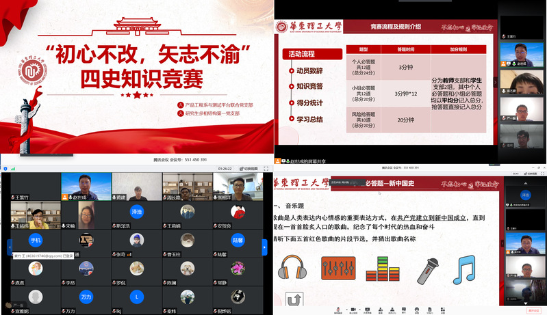 本次活动以知识竞赛的形式展开,分为个人必答、小组必答和抢答三个环节,由师生党员共同参与出题,设计了内容丰富、形式多样的题目,涉及到红色革命歌曲,重大历史事件,重大历史人物等。同时题目也注重逻辑思考,增加了线索推理,以提升各位教师党员和学生党员答题的趣味性和参与感。活动中广泛地利用线上办公的各类工具,例如以问卷星的形式收集题目答案,通过会议自带举手抢答功能答题等。