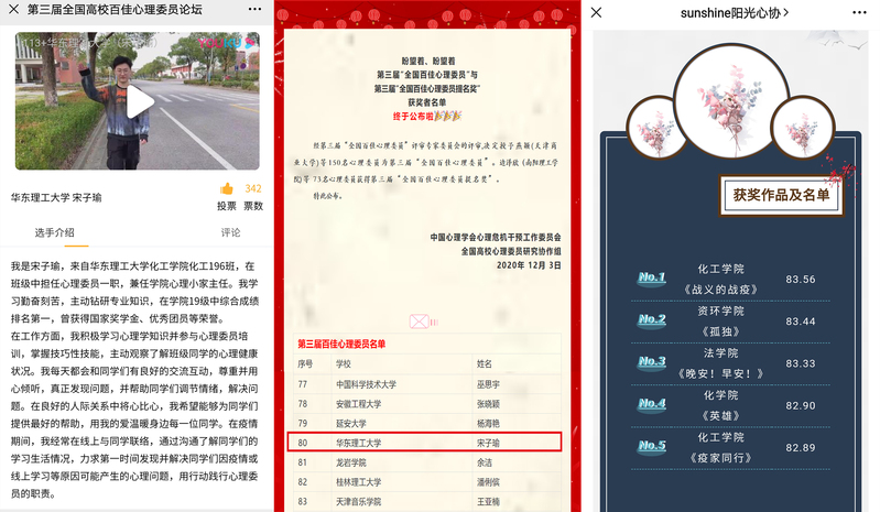 积极开展多维度心理健康教育活动,提升学生心理活动的参与度与体验感,营造健康向上的心理文化氛围,本学期先后开展了新生成长营、心理委员技能大赛、第二届心理微电影大赛、心理委员培训等活动,心理育人取得良好成效。其中《战义的战疫》获得校心理剧剧本大赛第一名,化工196班宋子瑜同学通过校内选拔参加2020年上海高校心理委员技能大赛并成功进入决赛,同时荣获第三届“全国百佳心理委员”。