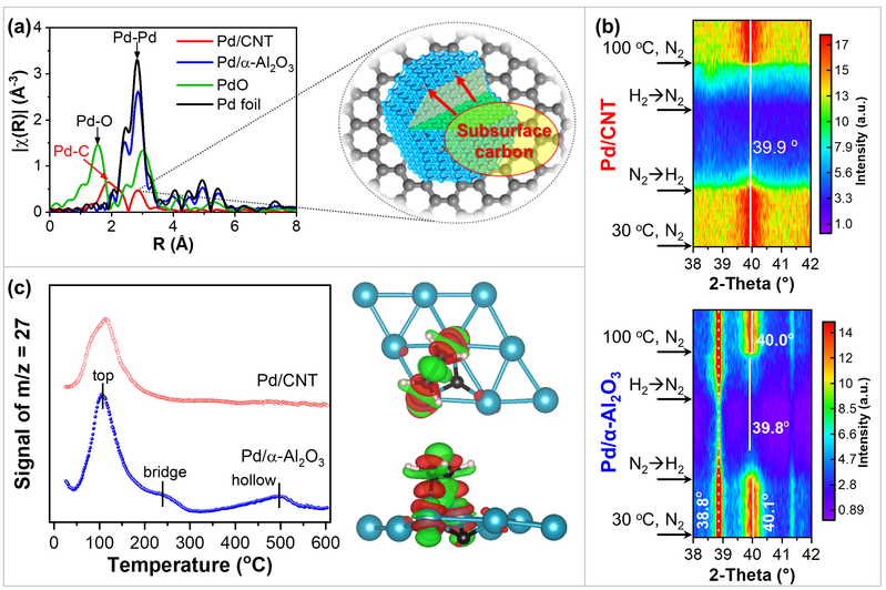 针对这一反应,研究人员从金属催化剂次表面结构调控入手,采用XAS、原位XRD、程序升温技术和DFT计算相结合的研究方法,发现了以纳米炭材料为载体制备的Pd催化剂次表面存在C原子。该次表面C原子能显著抑制Pd催化剂次表面氢物种的生成、促进目标产物乙烯的脱附,显著提高乙烯选择性。通过向炭载体中引入石墨氮物种,能进一步调变Pd活性位点电子结构,将乙烯选择性进一步提高约30%(AIChE J. 2020, 66, e16857)。此外,催化剂次表面结构调控策略也被应用于不饱和醛选择性加氢催化剂设计及调控,即通过在Cu催化剂次表面引入Pt物种,创制了高活性和高选择性CuPtx单原子合金加氢催化剂,该催化剂次表面Pt物种促进H2活化,且肉桂醛分子仍以C=O基团在Cu表面吸附活化(ACS Catal. 2019, 9, 9150; ACS Catal. 2020, 10, 3431)。