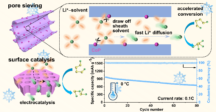 对此,功能炭材料研究团队提出了一种孔径筛分效应与电催化结合的策略,设计了表面分散CoP、氮掺杂的“贯穿孔”结构二维多孔碳纳米片,使其在Li+扩散过程中发挥离子助推器的作用。其中,贯穿孔结构,有利于提高溶剂化Li+的去溶剂化程度,进而提高Li+的扩散速率;CoP提供的活性位点,可提高溶剂化Li+的去溶剂化速率,并对多硫化锂发挥化学吸附和催化转化的功能。当该材料用作商用聚丙烯隔膜的涂层材料时,炭黑/硫正极展现出优异的电化学性能:大电流倍率性能(3C,775 mAh g−1)、循环稳定性(2C,800次,容量衰减率仅为0.048%)、高硫利用率(0.1C,80次,3.2 mAh cm−2)和低温耐受性(0oC,0.1C,80次, 647 mAh g−1)。此外,采用密度泛函理论、原位Raman、飞行时间二次离子质谱等分析表征手段,揭示了贯穿孔结构、CoP化学位点等对可溶性多硫化锂的物理阻挡-化学吸附-催化转化耦合强化机制。该研究对促进锂硫电池的商业化进程具有重要意义。