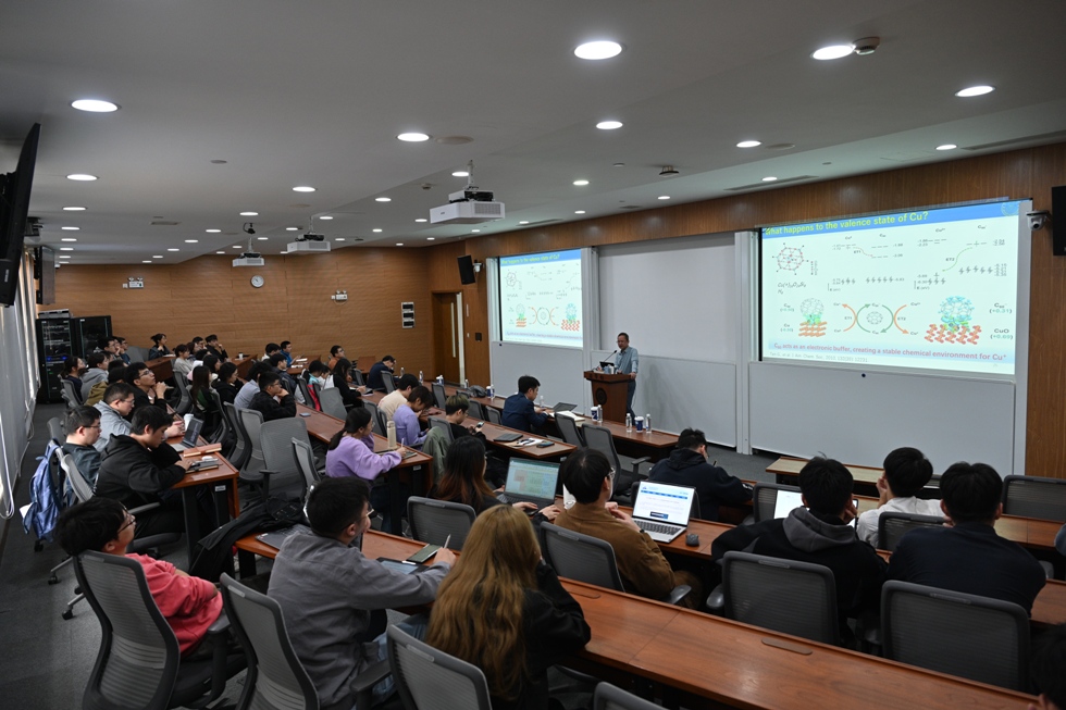 报告中,谢院士从“张力释放”和“局域芳香化”这两个稳定含相邻五元环的新型富勒烯的原理出发,详细阐述了富勒烯作为单分子器件的特性,以及其作为电子受体材料或电子缓冲材料在催化反应中的促进作用。谢院士还介绍了团队在富勒烯促进铜催化剂选择性加氢制醇方面的研究工作。这次报告引发了与会师生们的热烈讨论。谢院士耐心解答了与富勒烯包覆铜颗粒催化剂的活性位点以及富勒烯的电子缓冲性对不同金属能级的搭配等问题,并且通过分享团队研发过程中所面临的各种困难,鼓励大家坚定信心,勇于尝试,不断开展前沿性研究,为欧美无码