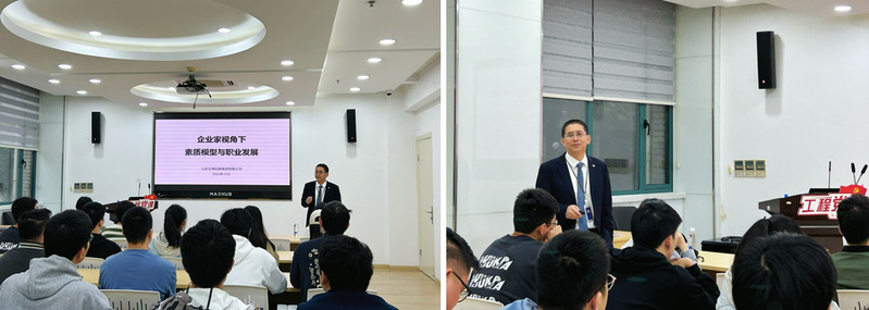 授课现场,马建斌以京博的职业发展体系为参考,深入分析了化工行业的人才素质模型,深挖行业最为看重的四种人才特质——专业知识、经验、能力以及职业素养和价值观。讲座最后,马建斌勉励同学们要热爱工作、有梦想、有追求,最大限度发挥自身潜力,令同学们深受激励和鼓舞。课程主题突出、内容丰富,既有理论方面的深刻阐释,又有生动事例的有力支撑,进一步加深了师生对行业人才需求的了解。