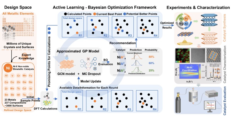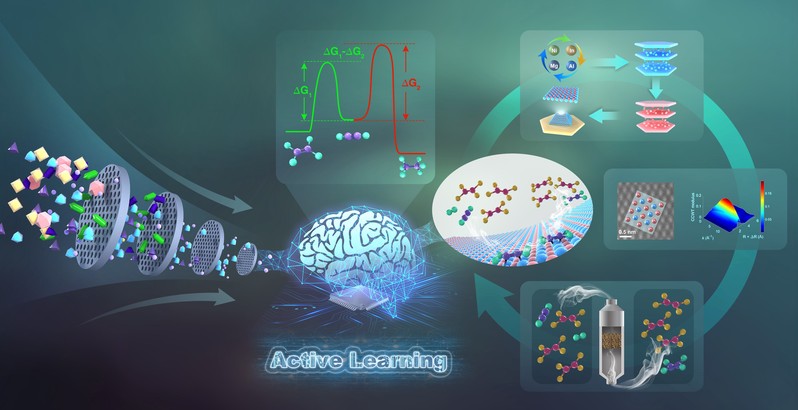 催化反应工程团队段学志教授、曹约强特聘研究员等在数据驱动的高性能低碳炔烃选择性加氢催化剂设计与创制方面取得新进展,基于机器学习构建的催化剂高通量筛选模型,快速筛选能够在原子尺度精准调控Ni活性位点结构的客体金属,实现了关键物种构型匹配以及目标反应路径的定向调控。相关成果以“Atomic Design of Alkyne Semihydrogenation Catalysts via Active Learning”为题在线发表在《美国化学会志》(Journal of the American Chemical Society)上。