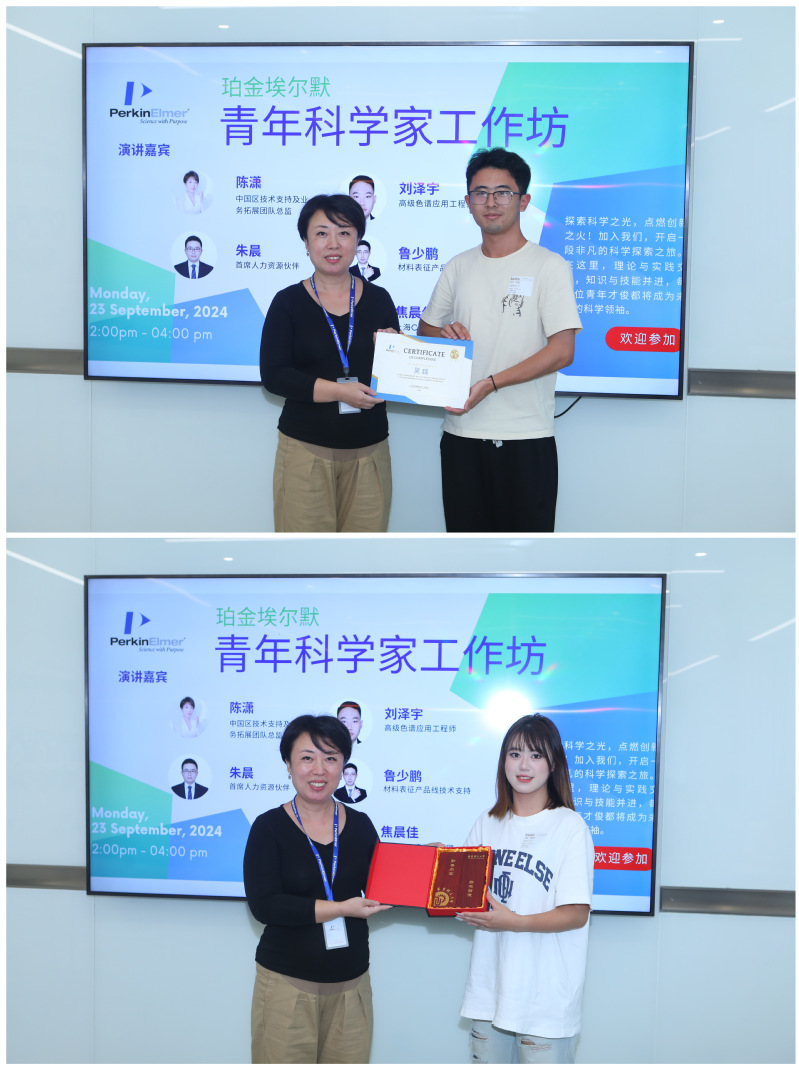 活动尾声,陈潇女士为参加活动的同学颁发了证书,以表彰他们的积极参与;学生代表也为珀金埃尔默送上了精美纪念品,表达了对公司长期支持教育事业、积极促进科研发展的崇高敬意。