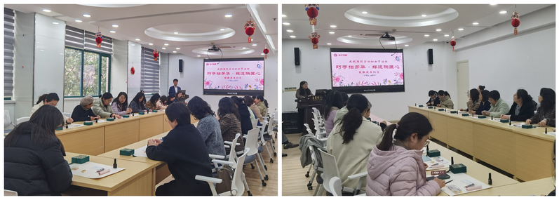 工会在实验十六楼108会议室举办了以“巧手拈芳华•非遗映匠心”为主题的螺钿胸针手作体验活动。学院党委书记段学志、党委副书记高艺霞、副院长吴艳阳以及30余位女教师参加了此次活动,活动由工会主席孙莉主持。