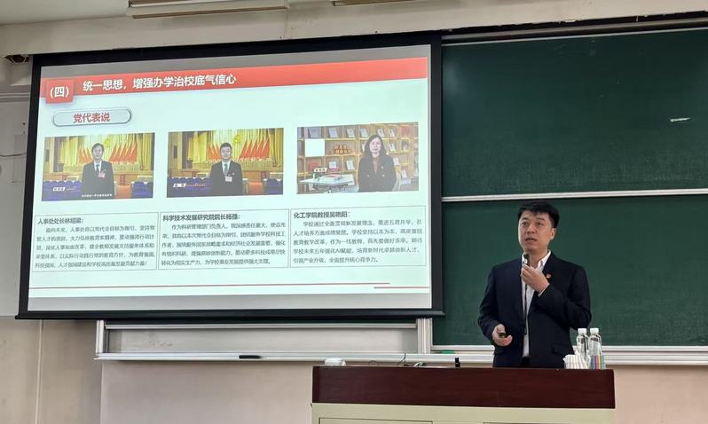 党委书记段学志以“凝心聚力谋发展 砥砺前行谱新篇”为题,从“充分认识第十二次党代会的里程碑意义”“准确把握党代会报告的丰富内涵”“贯彻落实党代会精神的实践要求”等3个方面,系统解读了学校第十二次党代会精神内涵,并结合学院特色和发展实际,指出了学院发展需要进一步加强和努力的方向。他强调,第十二次党代会明确了学校未来高质量发展的战略目标和思路举措,全院教职工要将思想和行动统一到学校决策部署上来,立足本职岗位,切实增强责任感和使命感,聚焦重点任务,在学科建设、人才培养、科研创新等方面精准发力,为学校“双一流”建设和教育强国战略贡献更大力量。