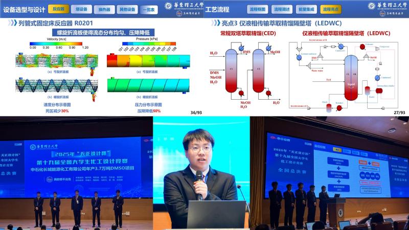 团队以某厂生产废气中的硫化氢为原料,采用二氧化氮氧化法设计了年产3.7万吨二甲基亚砜项目。历经7个月,团队成员从项目可行性研究、工艺方案比选论证、流程搭建、设备设计及选型、自动控制、总图布置、车间布置、安全评价、经济分析等多个方面,对项目进行精心设计,大胆应用四大创新:反应器结构创新、过程强化技术创新、分离技术创新、过程设备创新,符合中国制造2025的要求。团队的5位指导教师为李瑞江、陶国忠、马宏方、雷明、彭阳峰,另有沈荣春、魏永明、杨座国、杨敬一、黄子宾及袁佩青等6位教师深度参与了竞赛指导。欧美无码